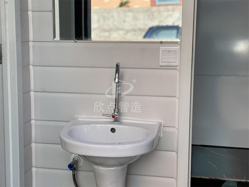 移動廁所內部配置:洗手池、鏡子、開關、LED燈、水龍頭